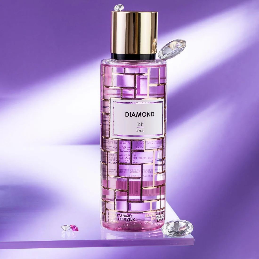 Ontdek Diamond, een verfijnde geurmist die je omhult met een sensuele en elegante geurcombinatie. De stralende tonen van oranjebloesem en zwarte bessen smelten samen met de verfijnde accenten van jasmijn en sinaasappel. Warme nuances van amandel, praliné en vanille voegen een onweerstaanbare zoetheid toe, perfect voor een vleugje luxe en verleiding.